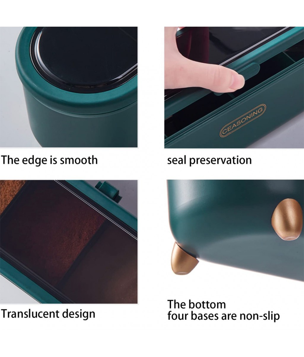 Made of plastic. Adopting a separated design, the appearance is beautiful. The transparent cover adopts a clamshell design, which has good sealing performance, can isolate oil and dust, and is not afraid of moisture. Can keep seasonings dry, spoon design, seasonings do not mix flavors, more delicious.
